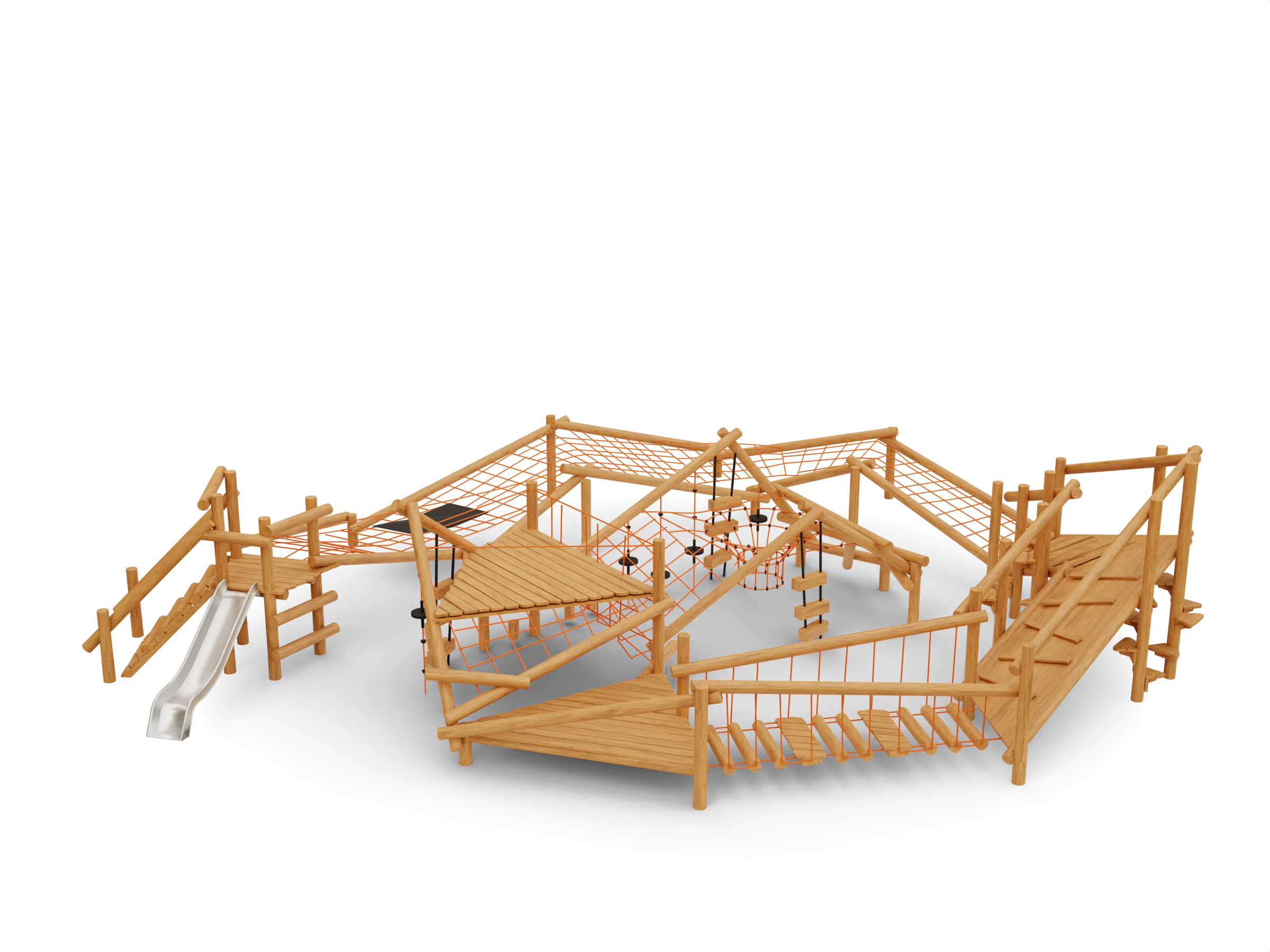 Спецификация - Каркас, обшивка - дерево, покрытие - антисептик, масло террасное атмосферостойкое или акриловая эмаль атмосферостойкая для древесины. Канатные сети, лазы - канат армированный 16мм, фурнитура из коррозионностойких материалов.