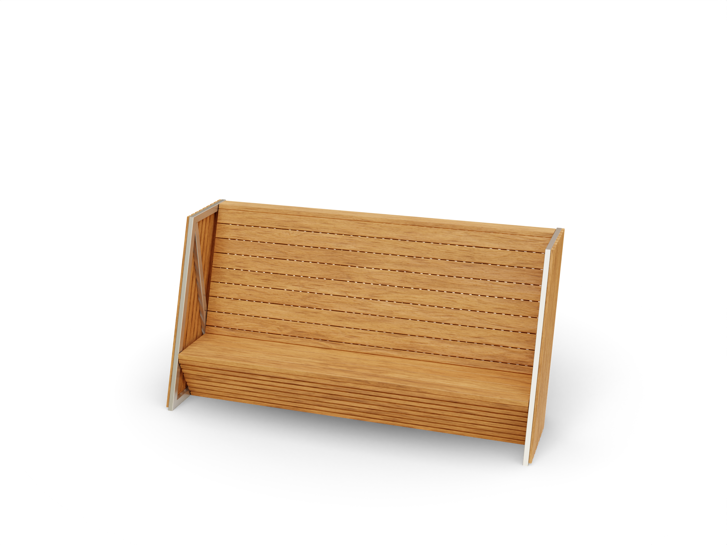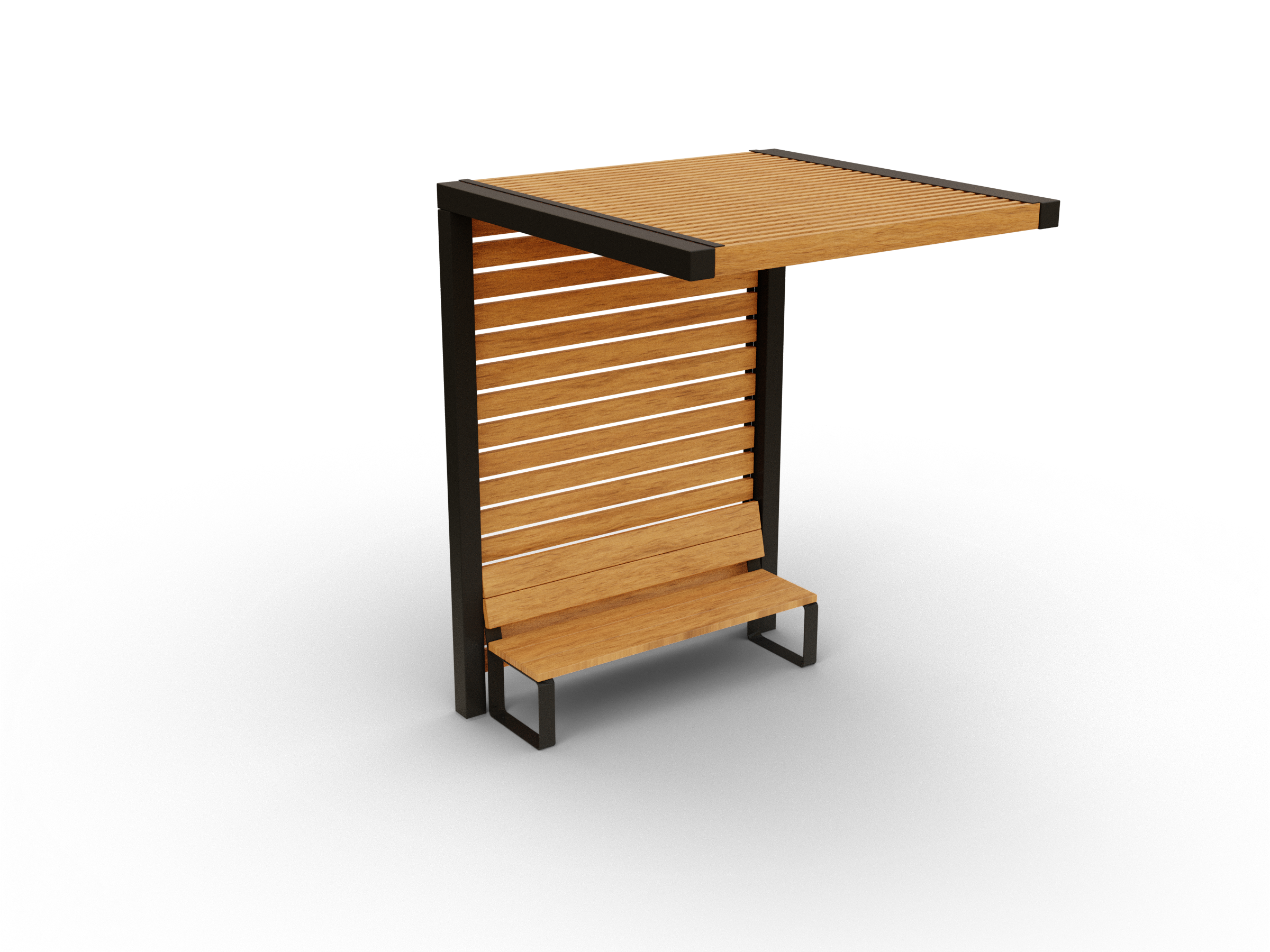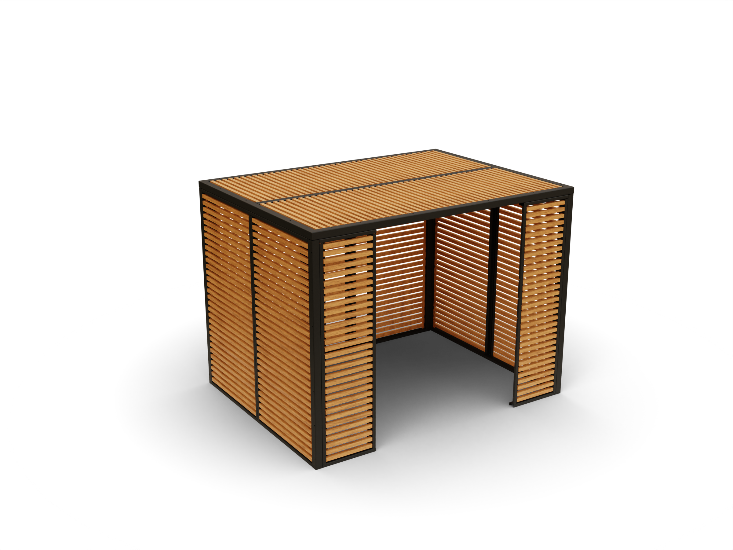 Природные формы, натуральное дерево, бетон и металл. - Каркас - сталь конструкционная, покрытие - цинкование, окраска полимерным порошком или двухкомпонентной полиуретано-акриловой эмалью RAL 9022. Обшивка - лиственница, покрытие - антисептик, масло террасное атмосферостойкое для древесины. Фурнитура из коррозионностойких материалов.