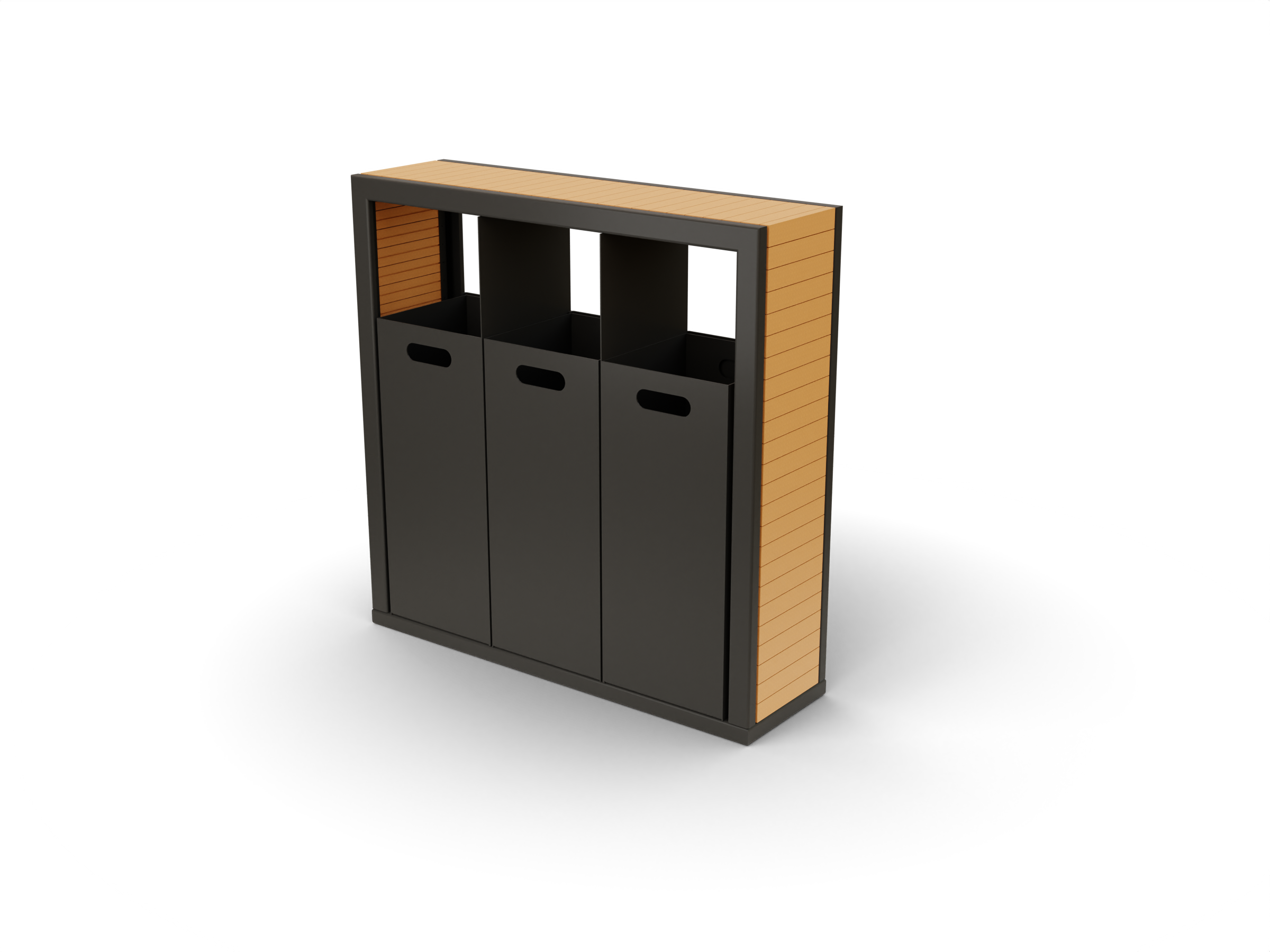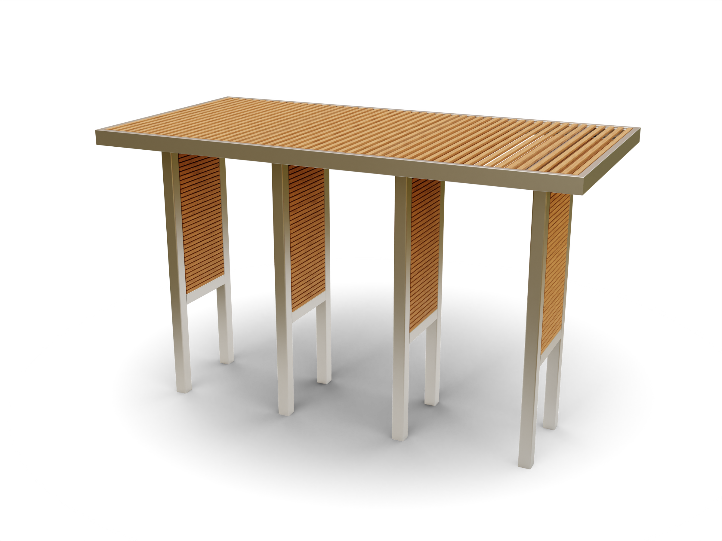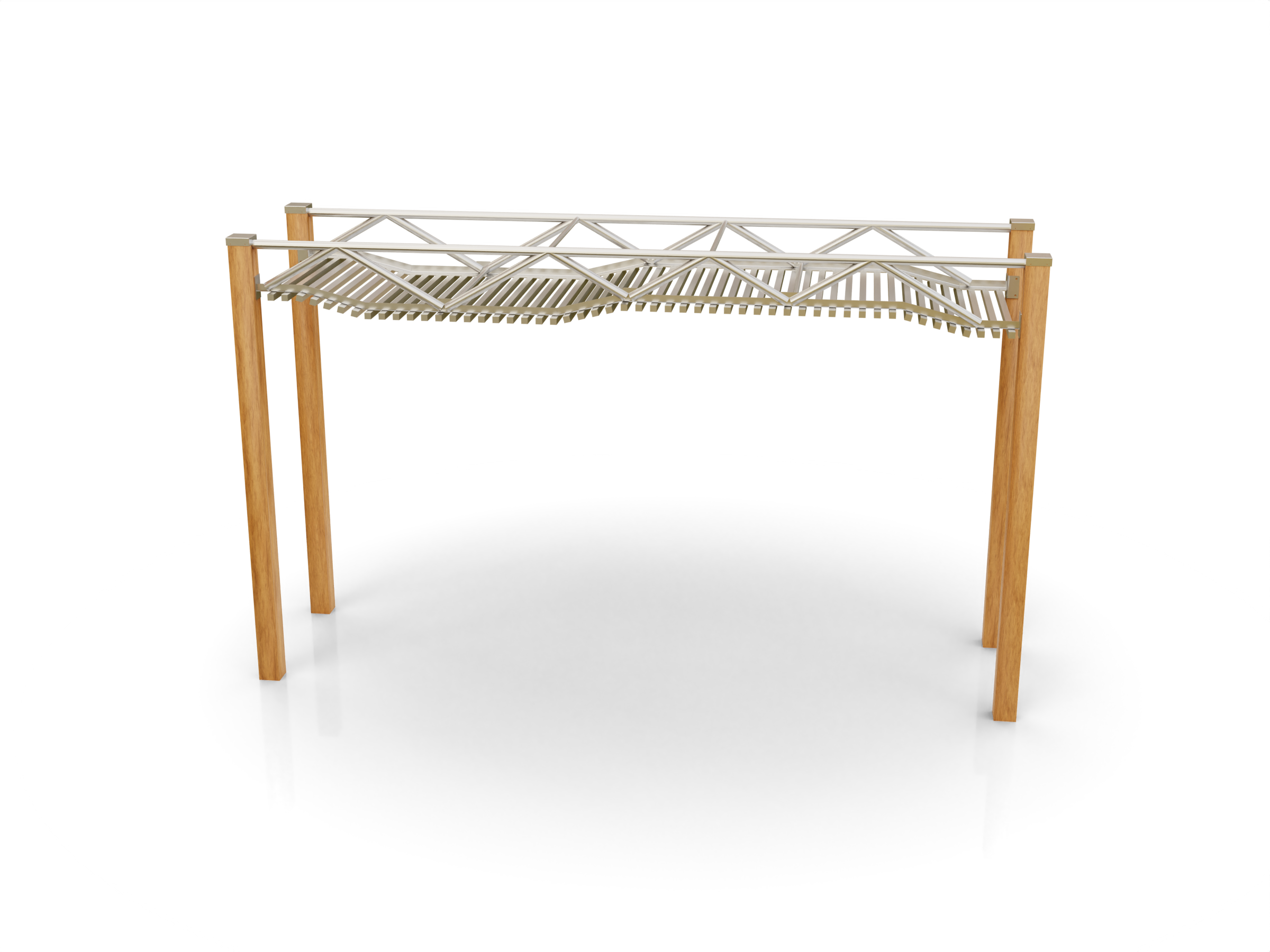 Природные формы, натуральное дерево, бетон и металл. - Каркас - сталь конструкционная, покрытие - цинкование, окраска полимерным порошком или двухкомпонентной полиуретано-акриловой эмалью RAL 9022. Обшивка - лиственница, покрытие - антисептик, масло террасное атмосферостойкое для древесины. Фурнитура из коррозионностойких материалов.