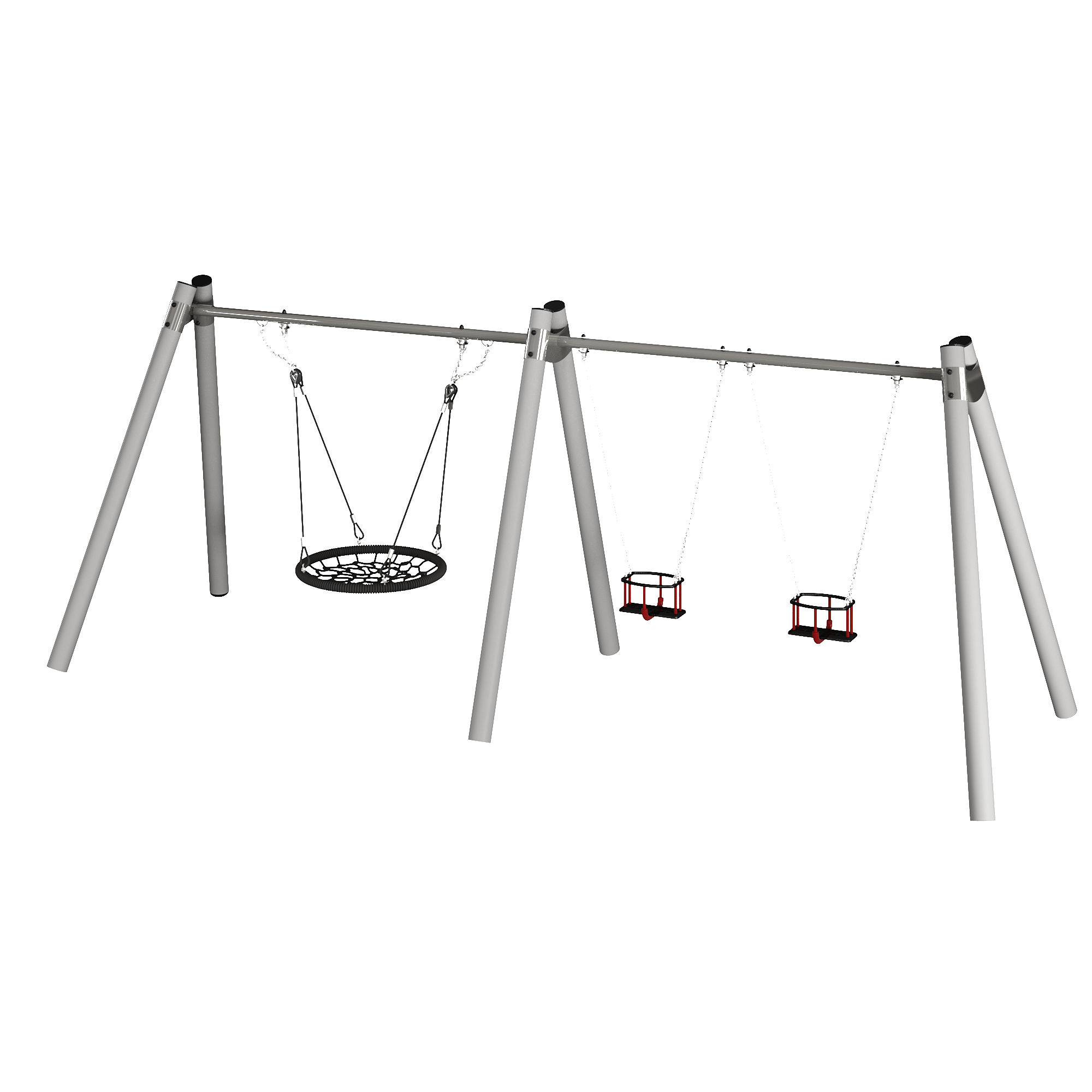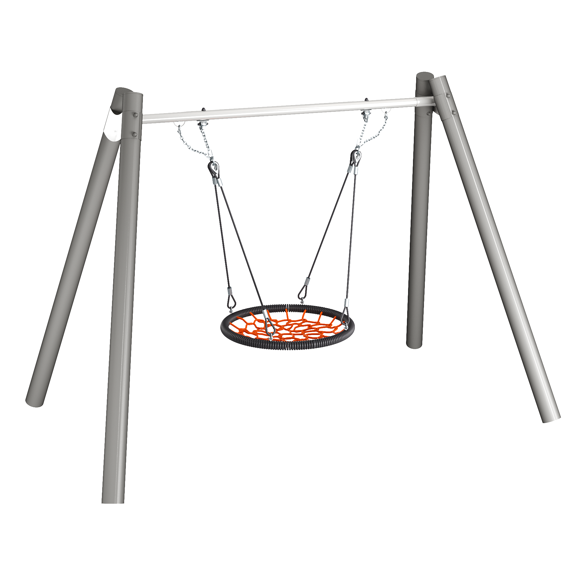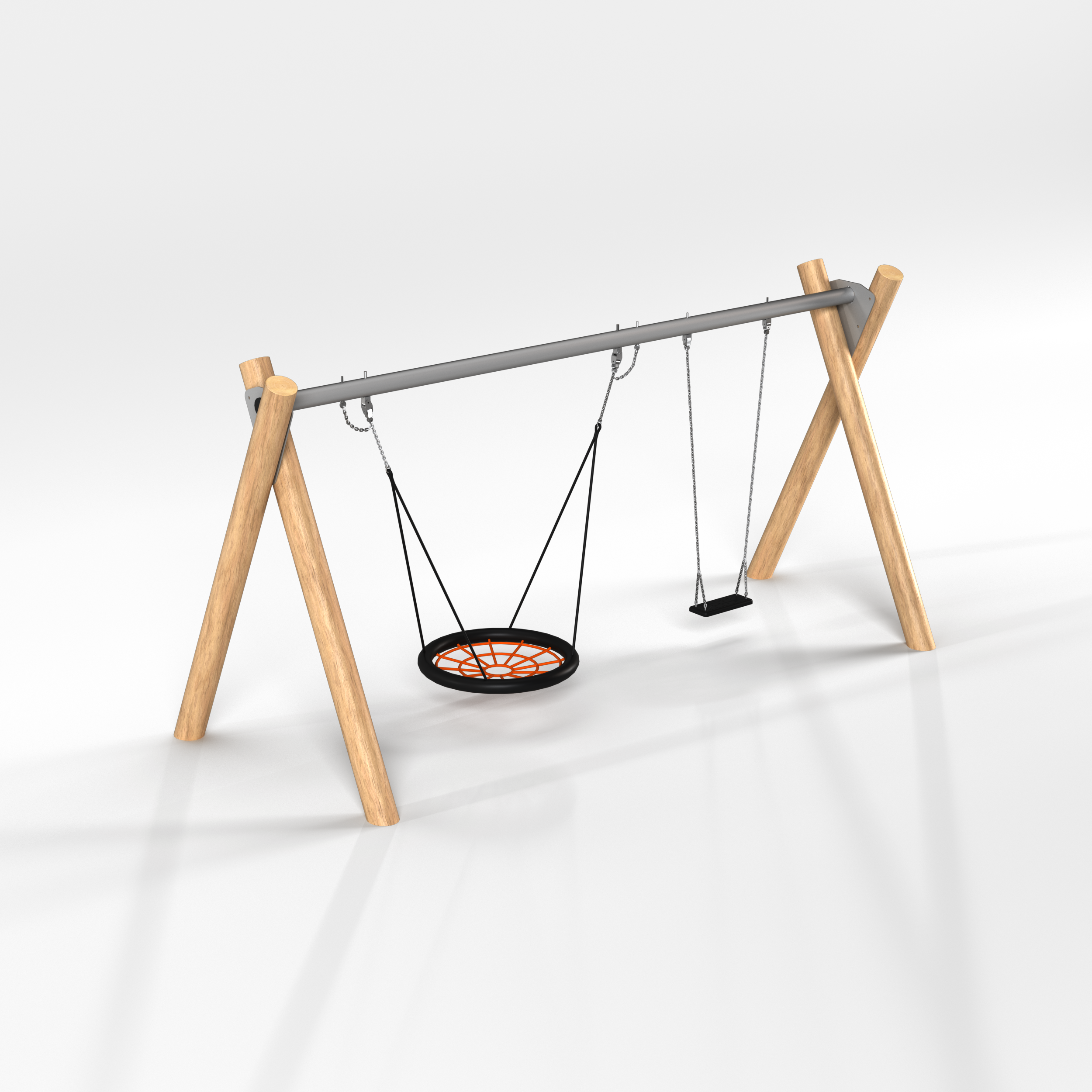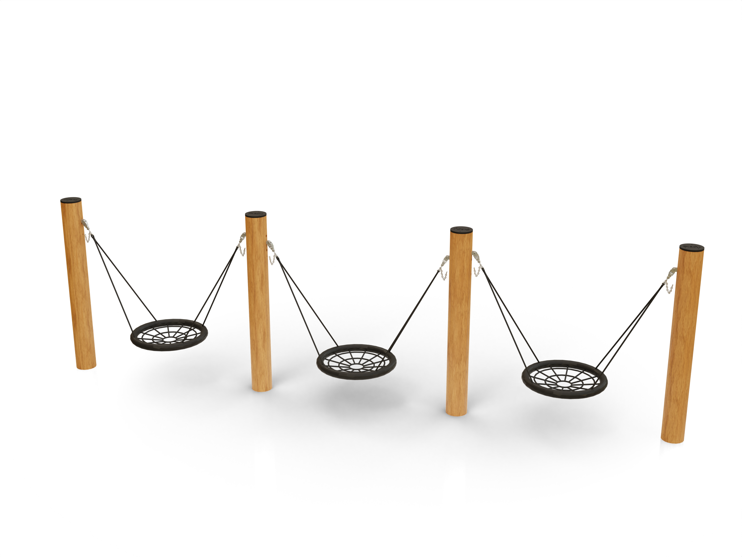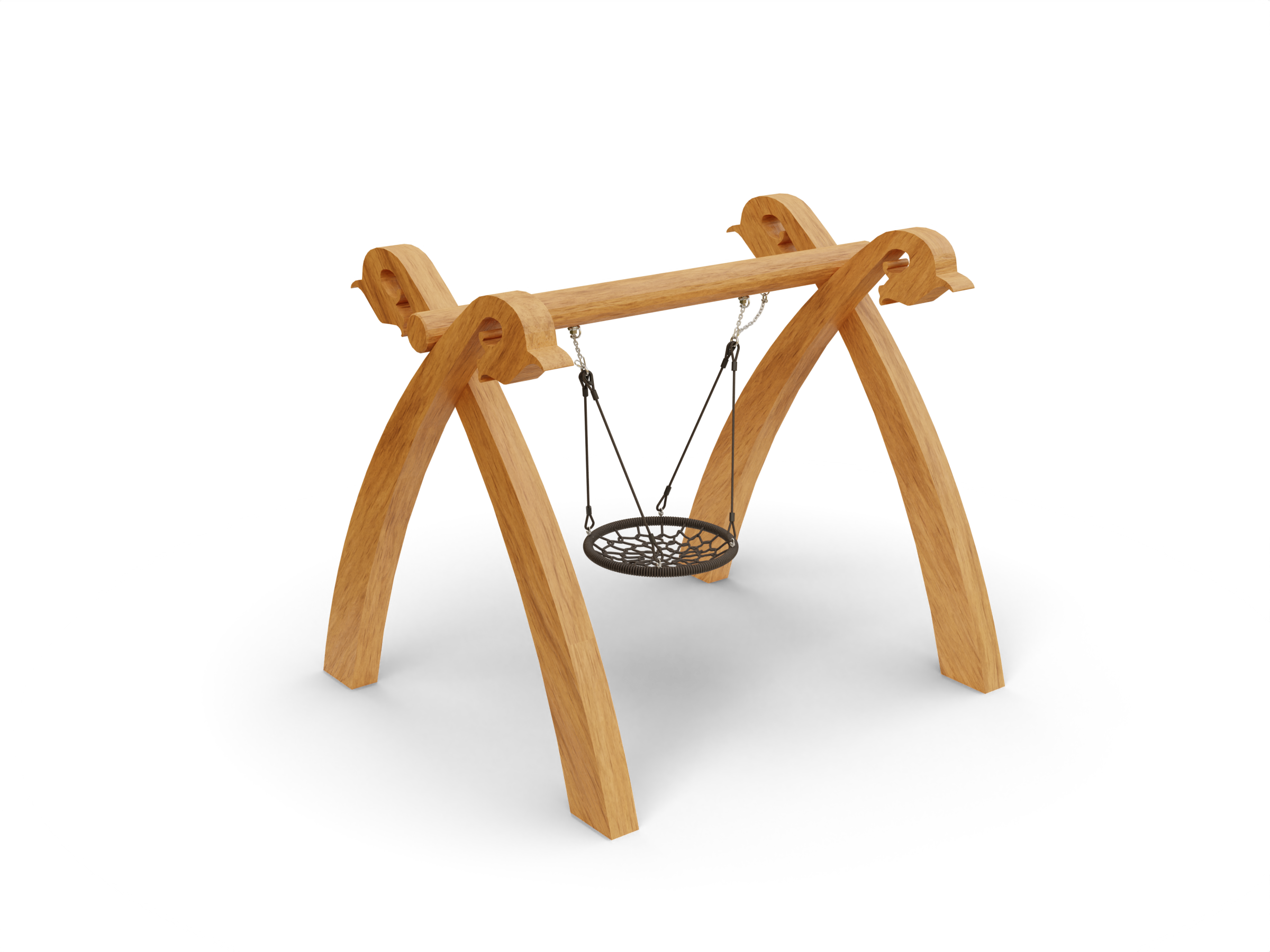Спецификация - Деревянные (Каркас - дерево, обработанные антисептиком и маслом террасным атмосферостойким для древесины 2 слоя. Подвесы - канат армированный 16мм. Фурнитура из коррозионностойких материалов); Металлические (Каркас - сталь конструкционная, покрытие - цинкование, окраска полимерным порошком или двухкомпонентной полиуретано-акриловой эмалью RAL 9022. Подвесы - канат армированный 16мм. Качели «гнездо» - утяжеленный обод, плетение внутри кольца - четырехпрядный мягкий канат диаметром 16 мм. Фурнитура из коррозионностойких материалов)